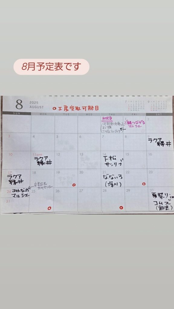 8月は7月便がおしまして、お盆催事イベントなどもあり引き取り発送ともに8月後半からとさせていただくことにしました。ひとりでやっているので、お客様にはご不便おかけしますが、申し訳ありません、よろしくお願いします🙇♀️